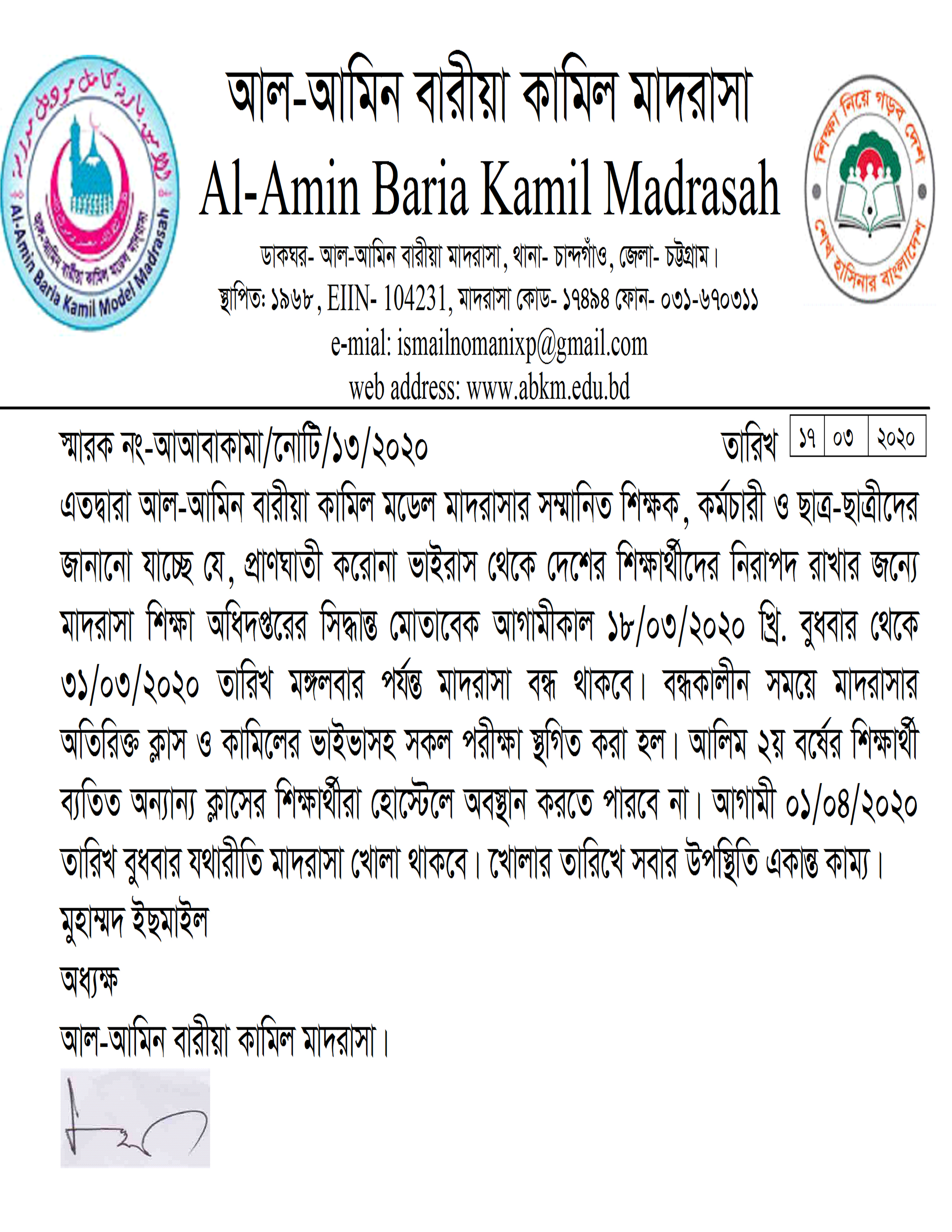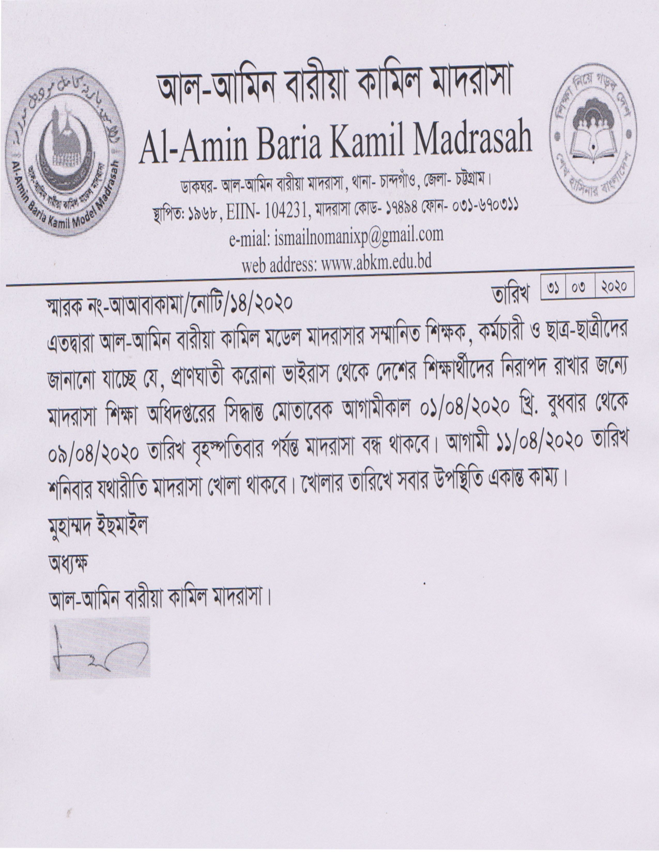 প্রাণঘাতী করোনা ভাইরাসের কারণে আগামী ০১/০৪/২০২০ইং তারিখ থেকে ০৯/০৪/২০২০ইং তারিখ পর্যন্ত মাদরাসা বন্ধ থাকবে। |