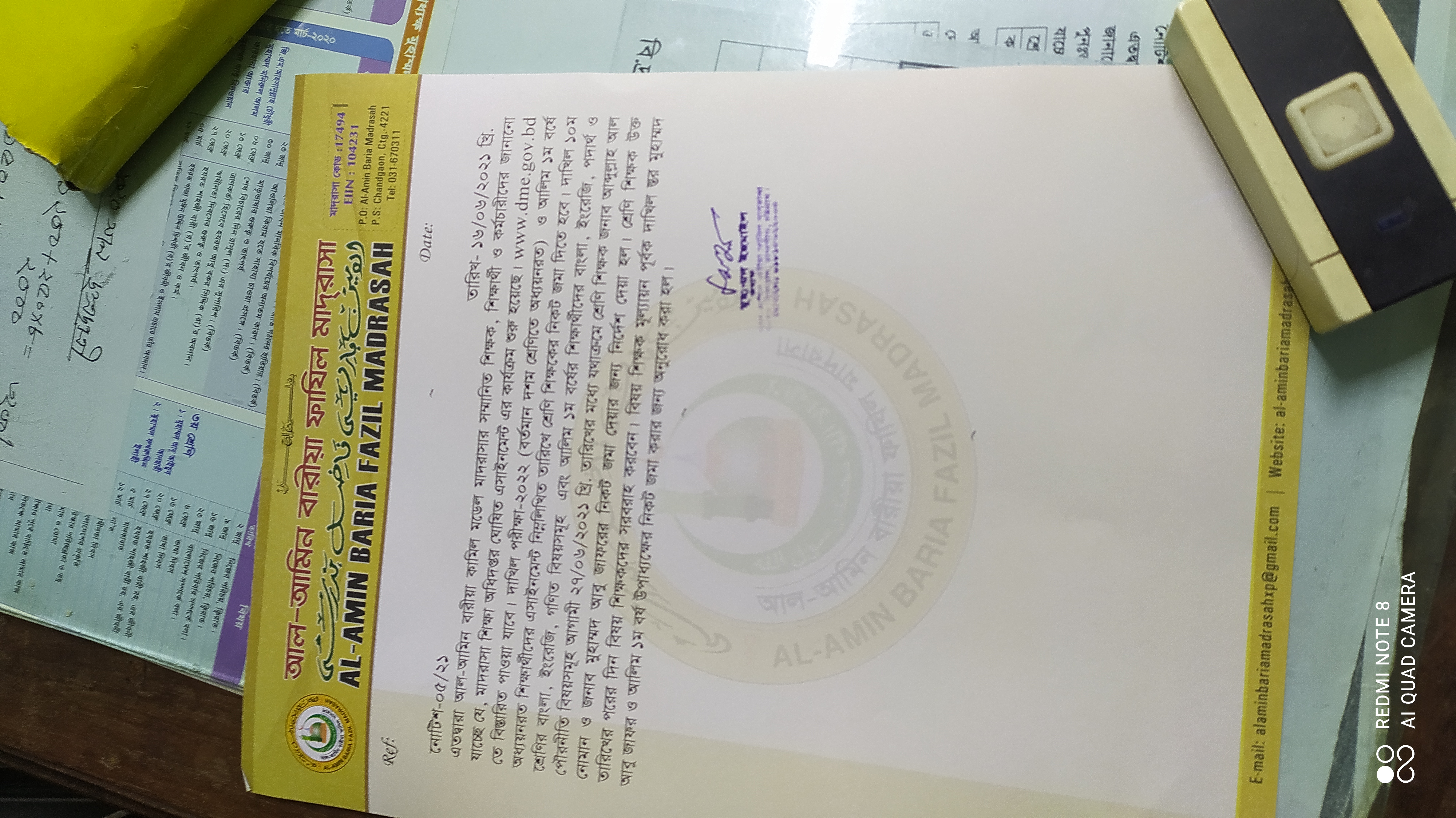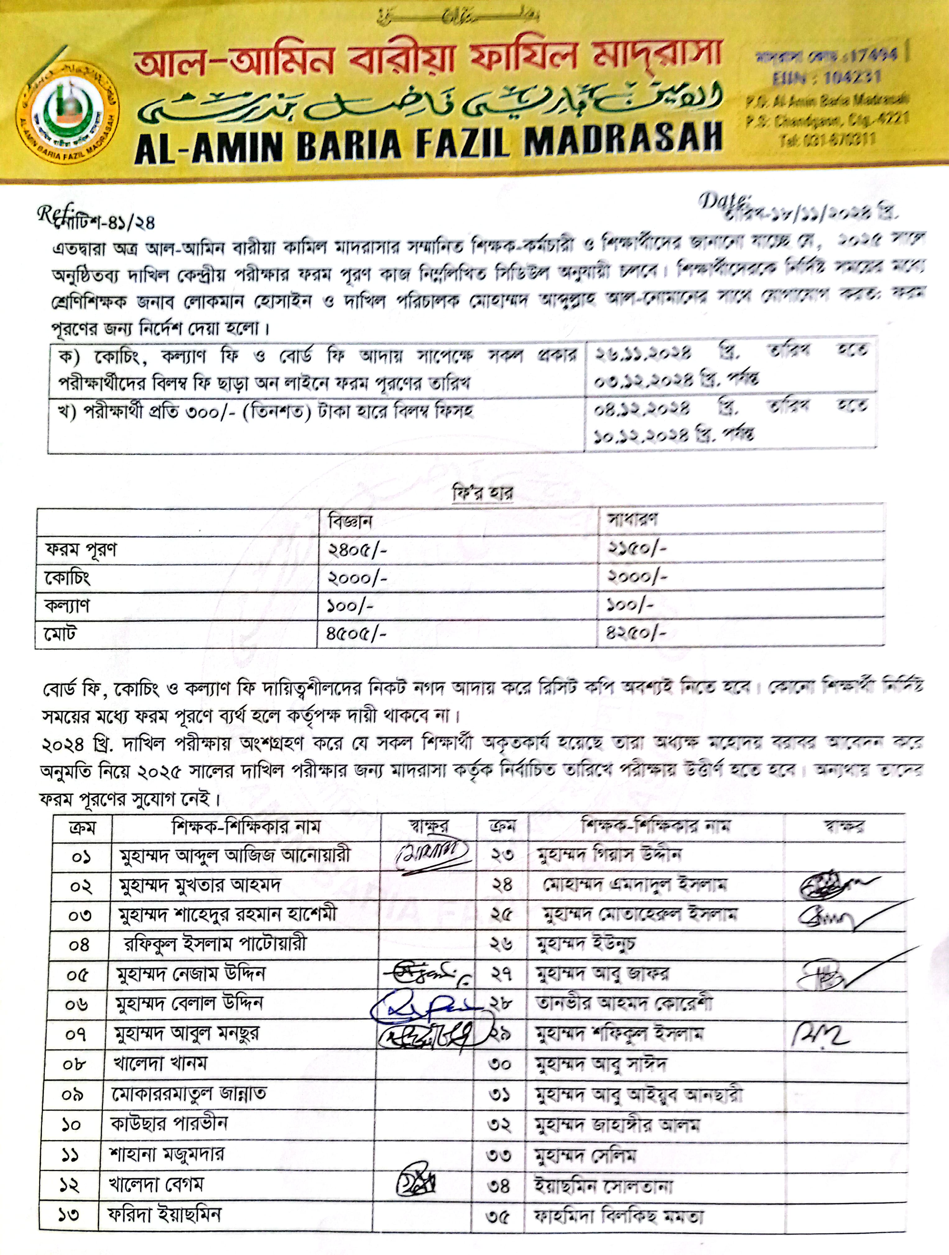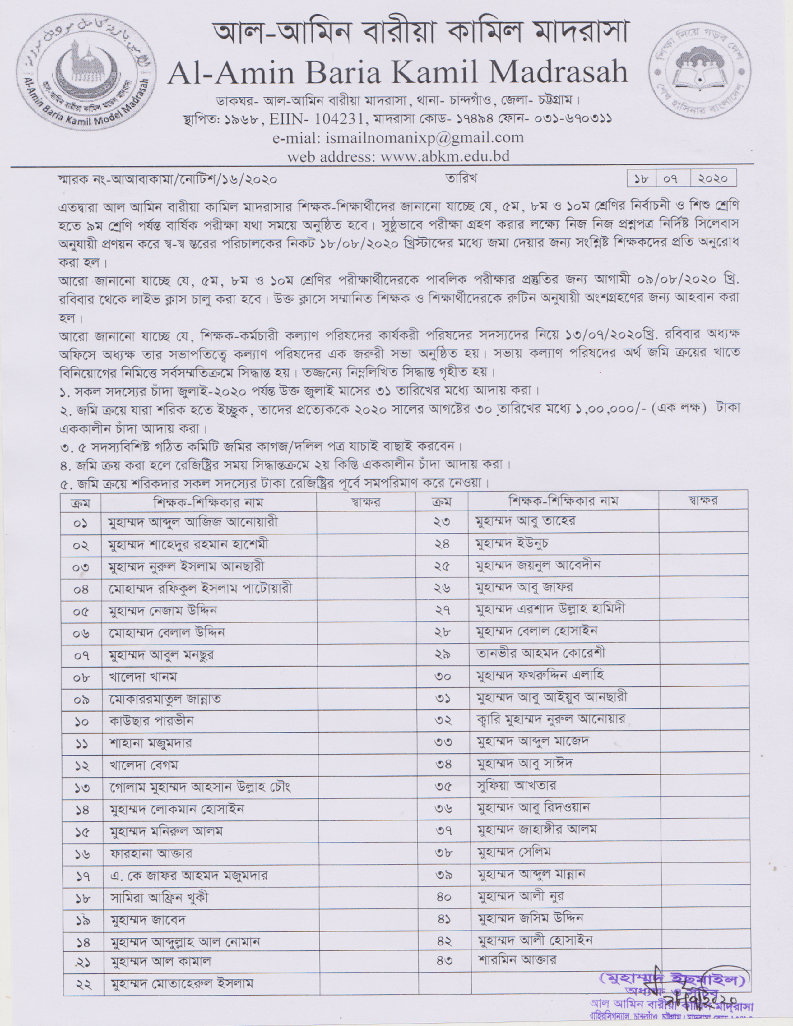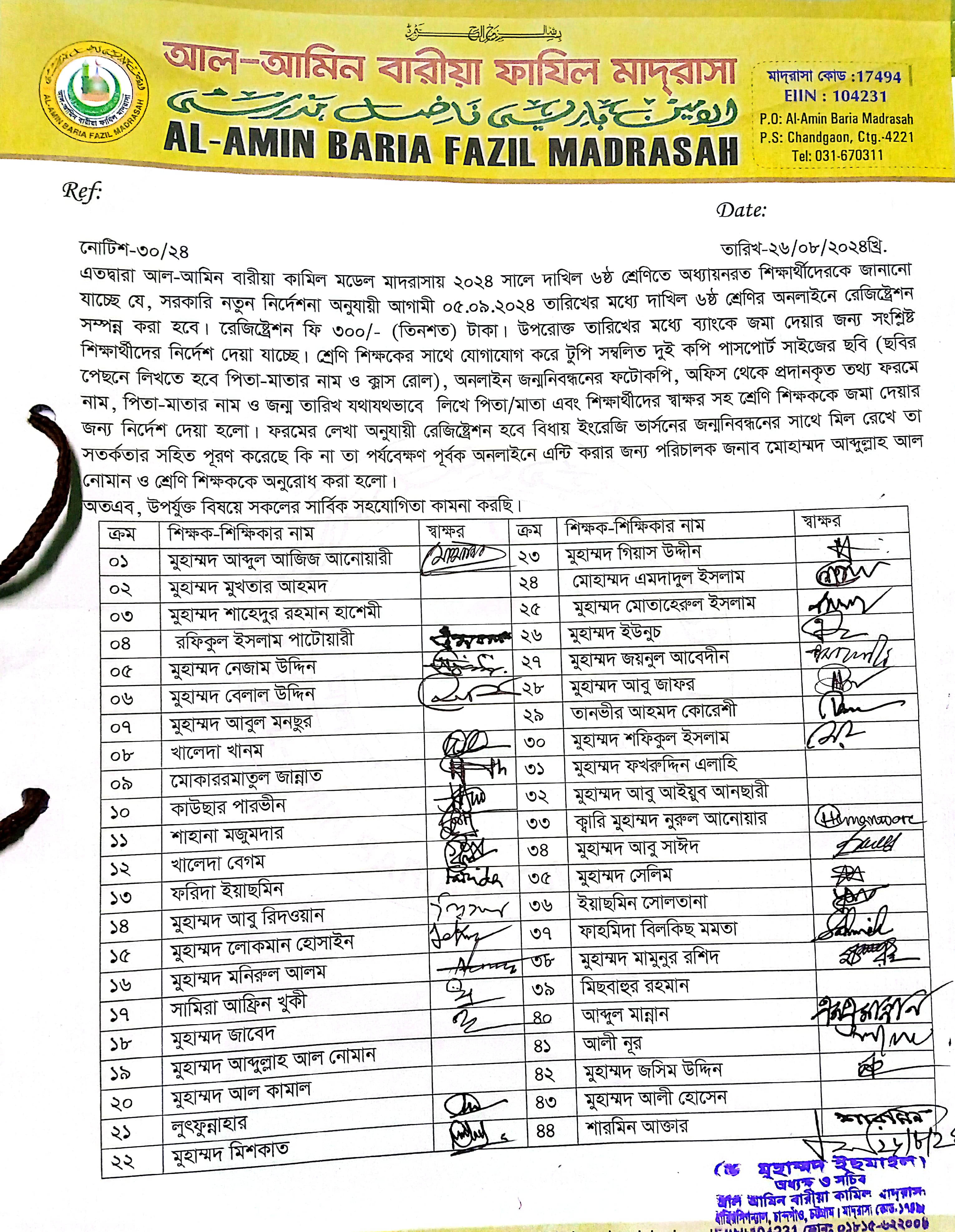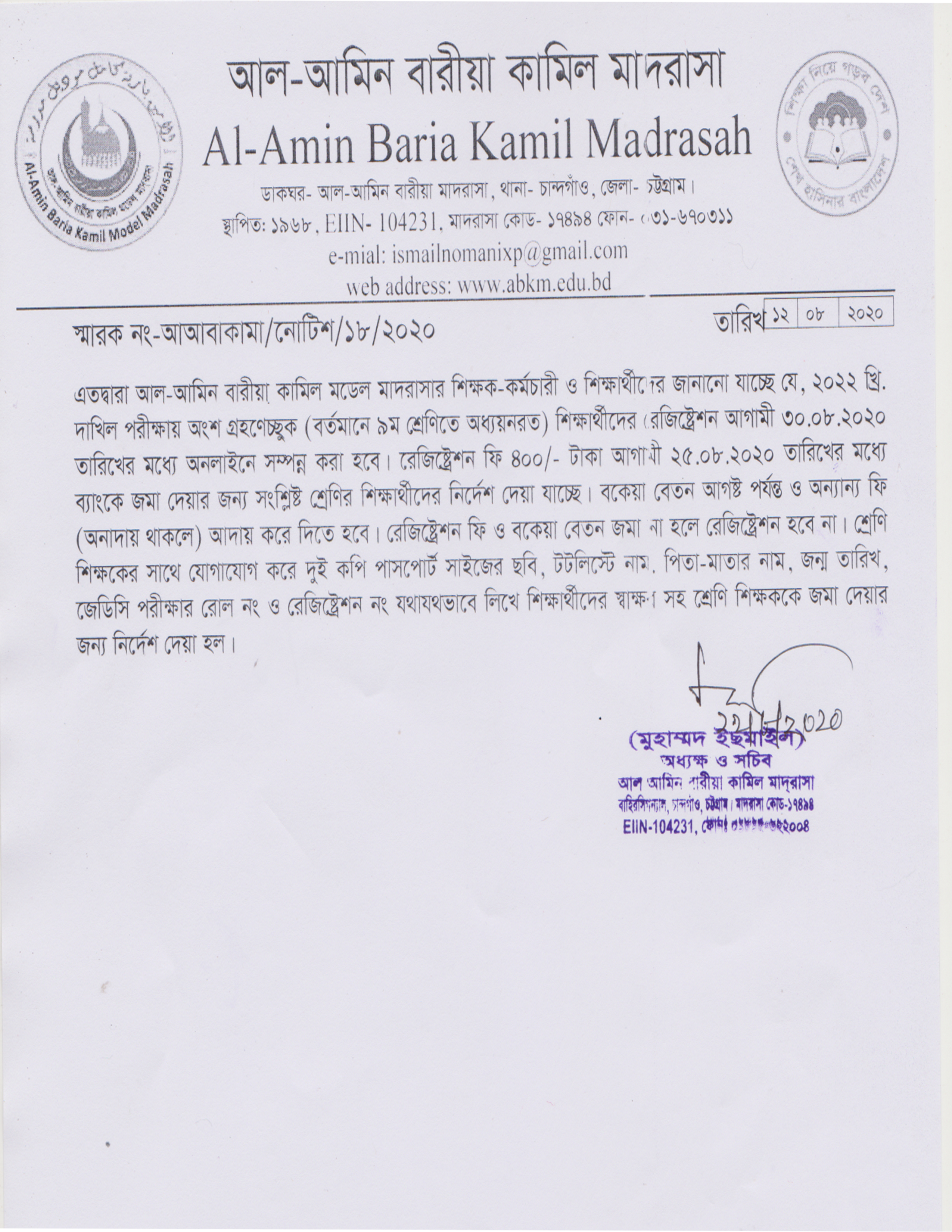 দাখিল নবম শ্রেণির মাসিক বেতন ও রেজিষ্ট্রেশন ফি'র জমা রশিদ প্রদর্শন করে আগামি ২৭/৮/২০২০ সকাল ১০টায় অফিসে এসে টটলিস� |