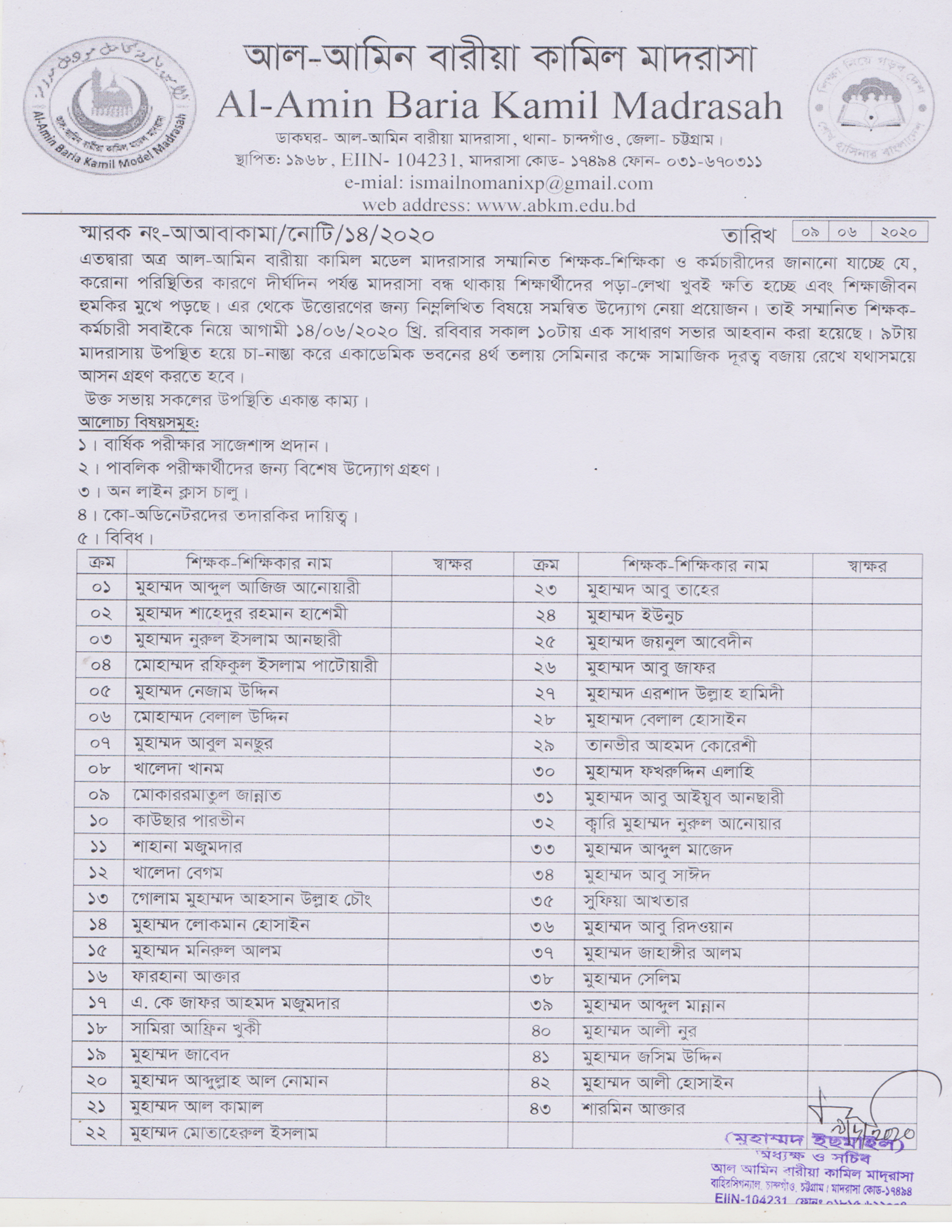 ১৪/০৬/২০২০ ইং তারিখ রবিবার সকাল ১০টায় শিক্ষক-কর্মচারী সবাইকে মাদরাসায় উপস্থিত থাকার জন্য অনুরোধ করা যাচ্ছে |